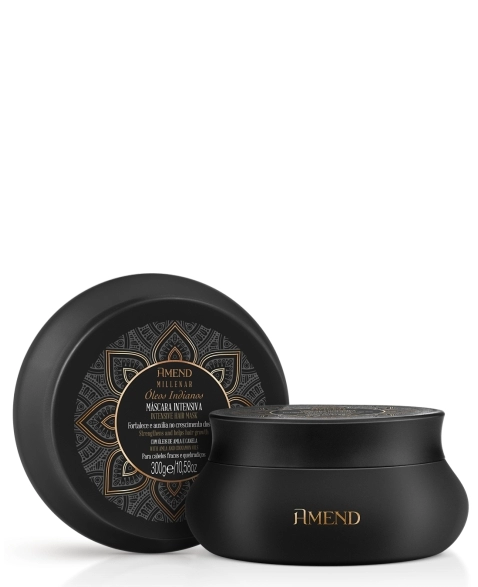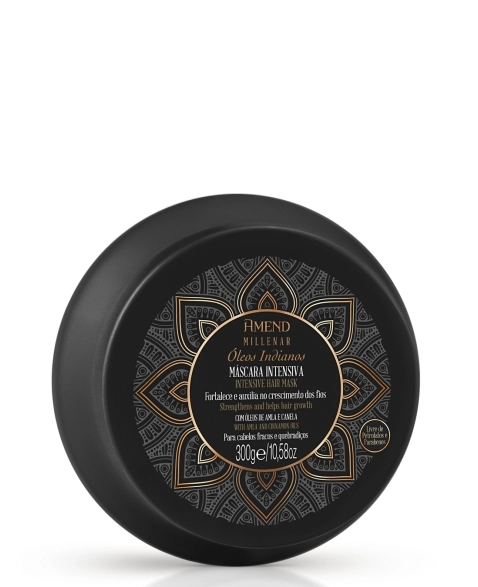 Máscara Intensiva Amend Millenar Óleos Indianos inspirados na beleza dos cabelos das mulheres indianas, desenvolvemos uma máscara que nutre profundamente os fios enquanto proporciona força e vitalidade para os cabelos fracos e quebradiços crescerem fortes e saudáveis, devido à combinação fortalecedora do Óleo de Amla, tonificante do Óleo de Canela e reparadora do Tri-Fort Complex*.