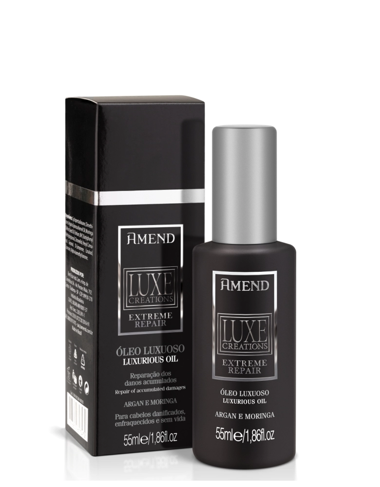 Óleo Amend Luxe Creations Extreme Repair possui óleos de argan e moringa reparam e nutrem os fios sem pesar. Ajudam a melhorar a aparência, proporcionando brilho imediato e elasticidade ao cabelo.